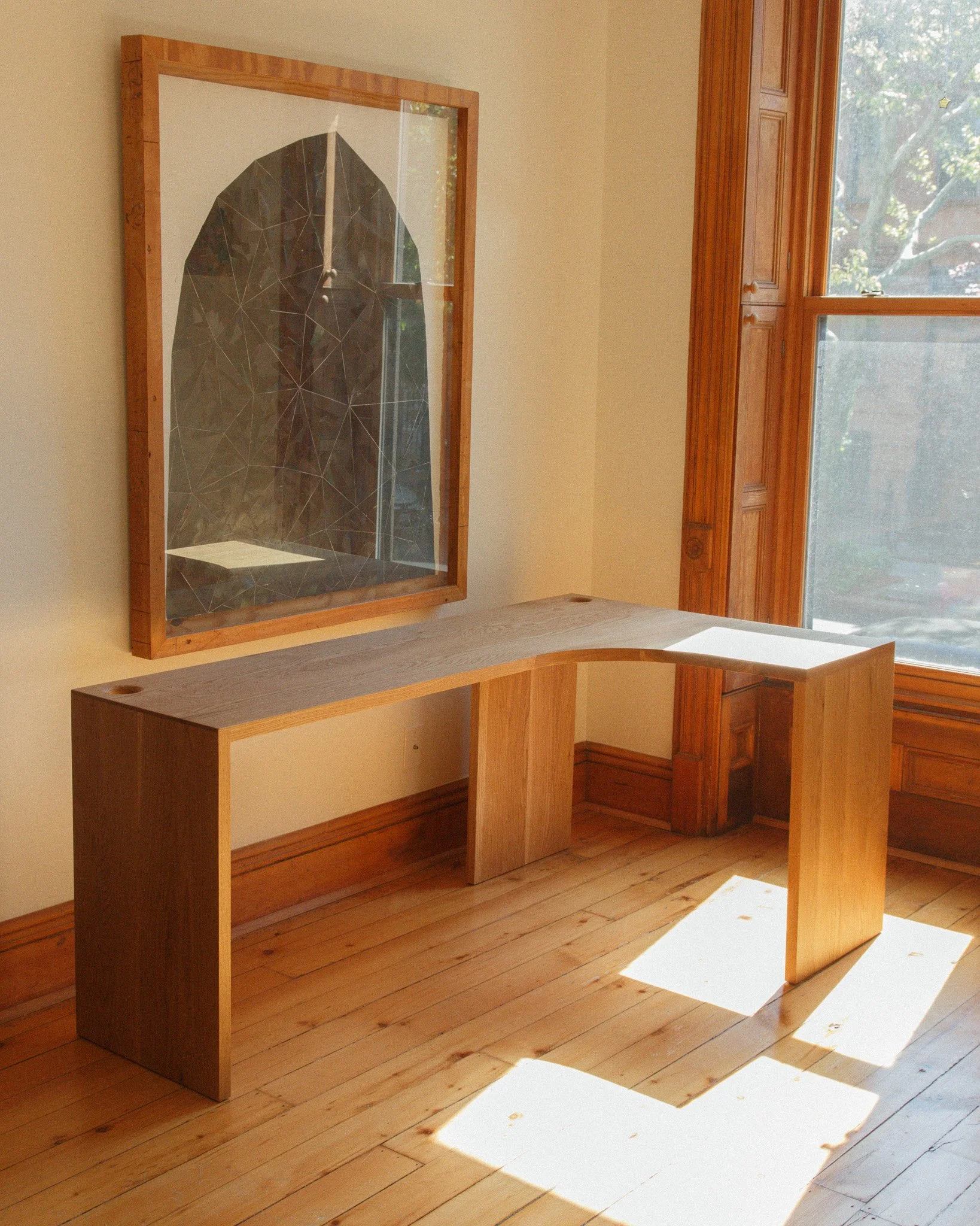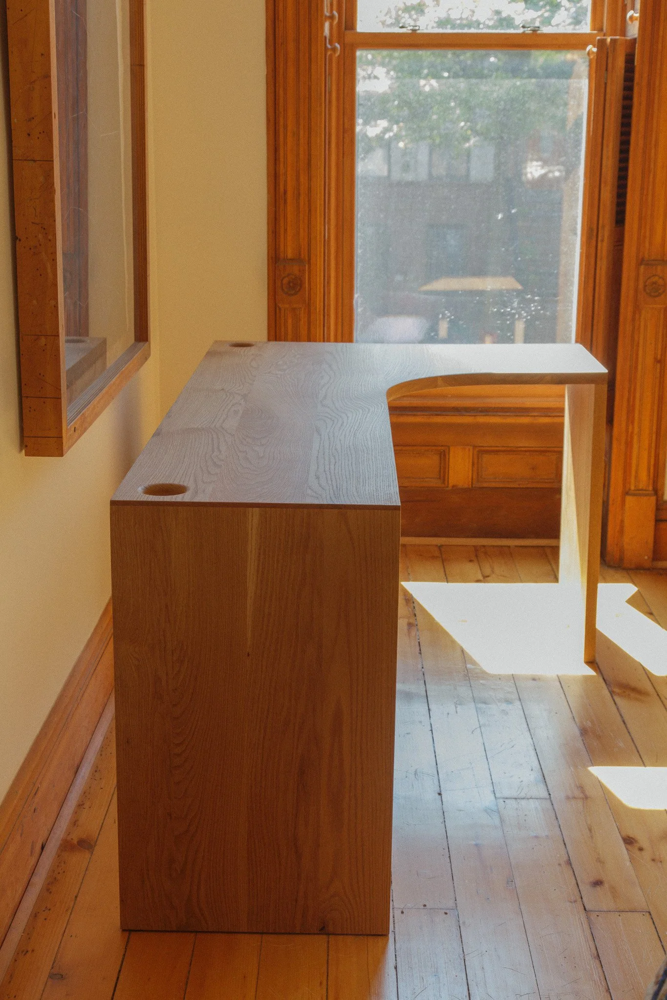 Writing table in white oak. Rounded over holes on the rear for cable management.