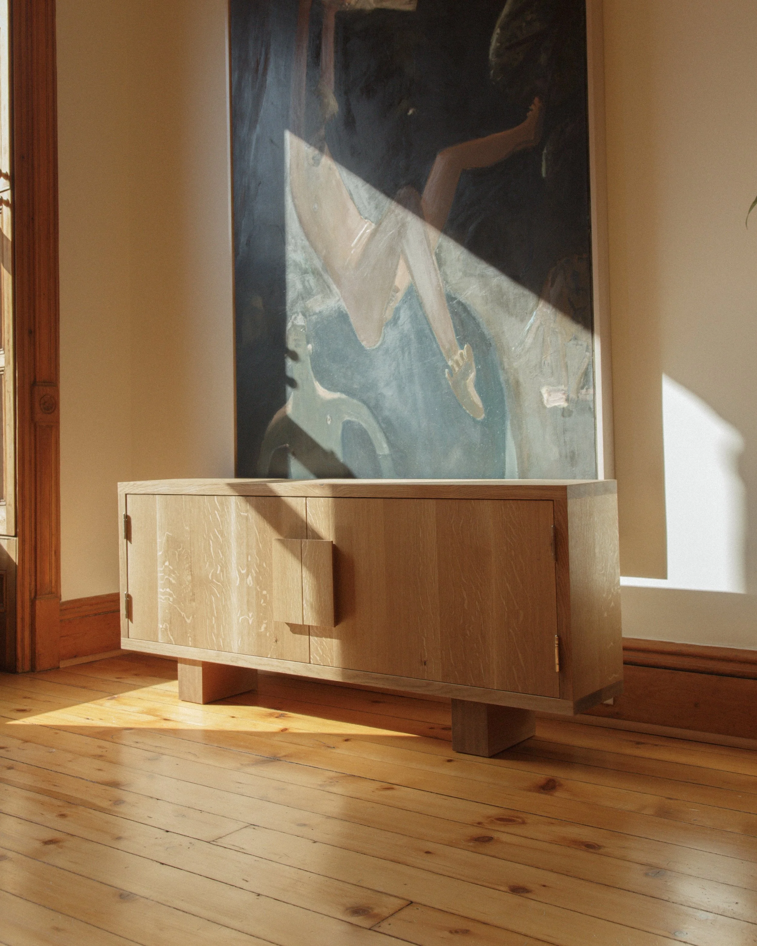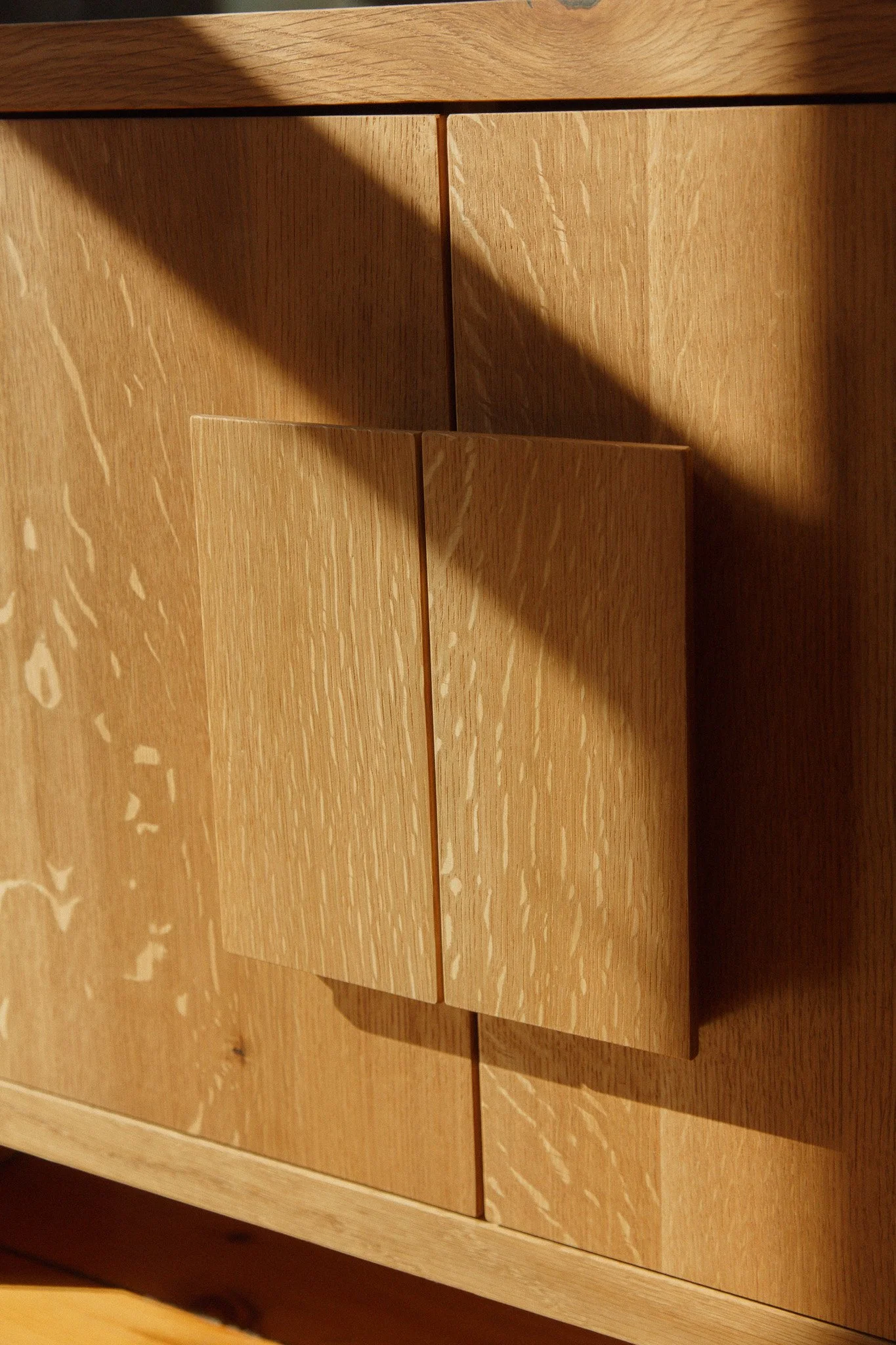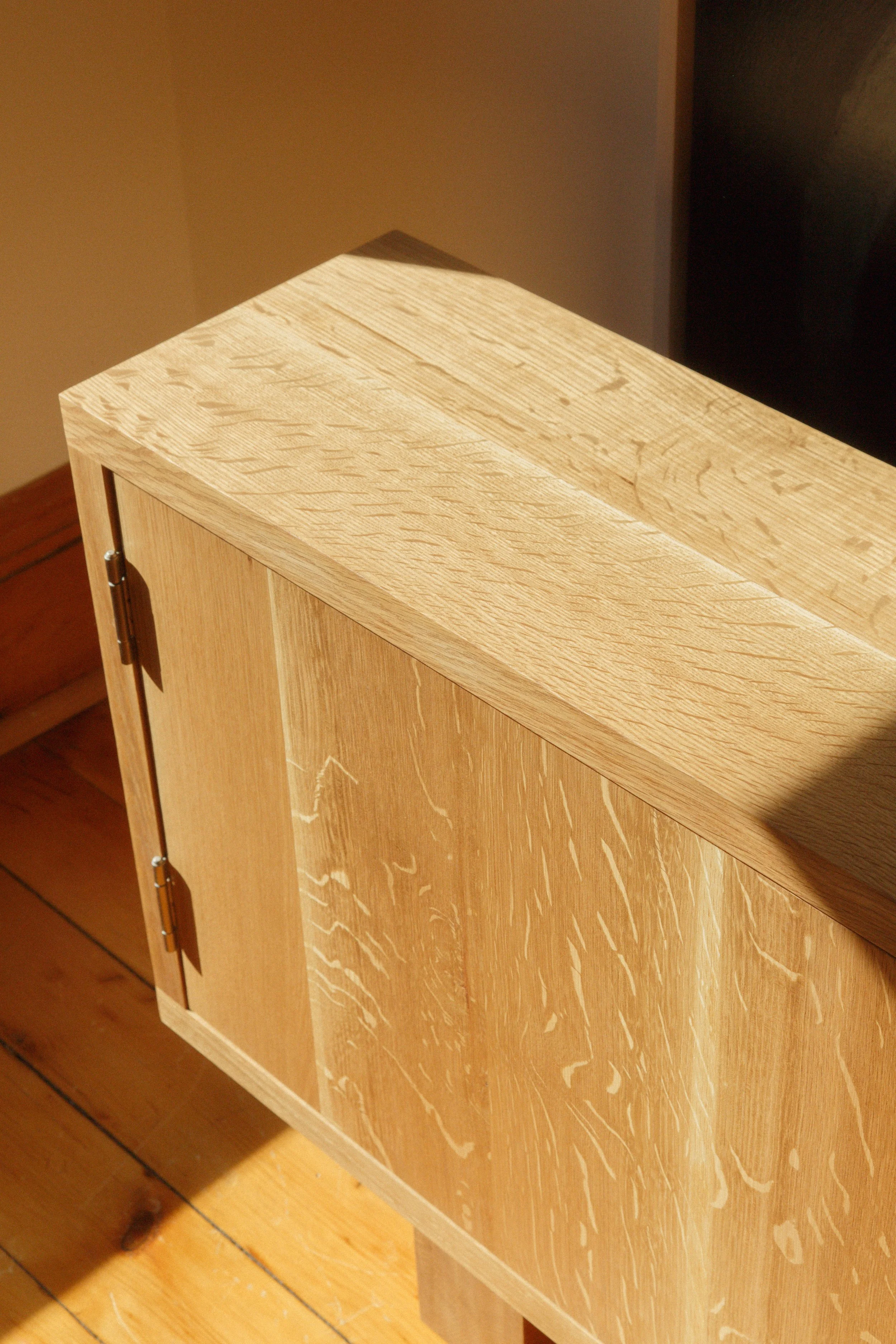 Puesta cabinet made from quarter sawn oak with silver hinges.